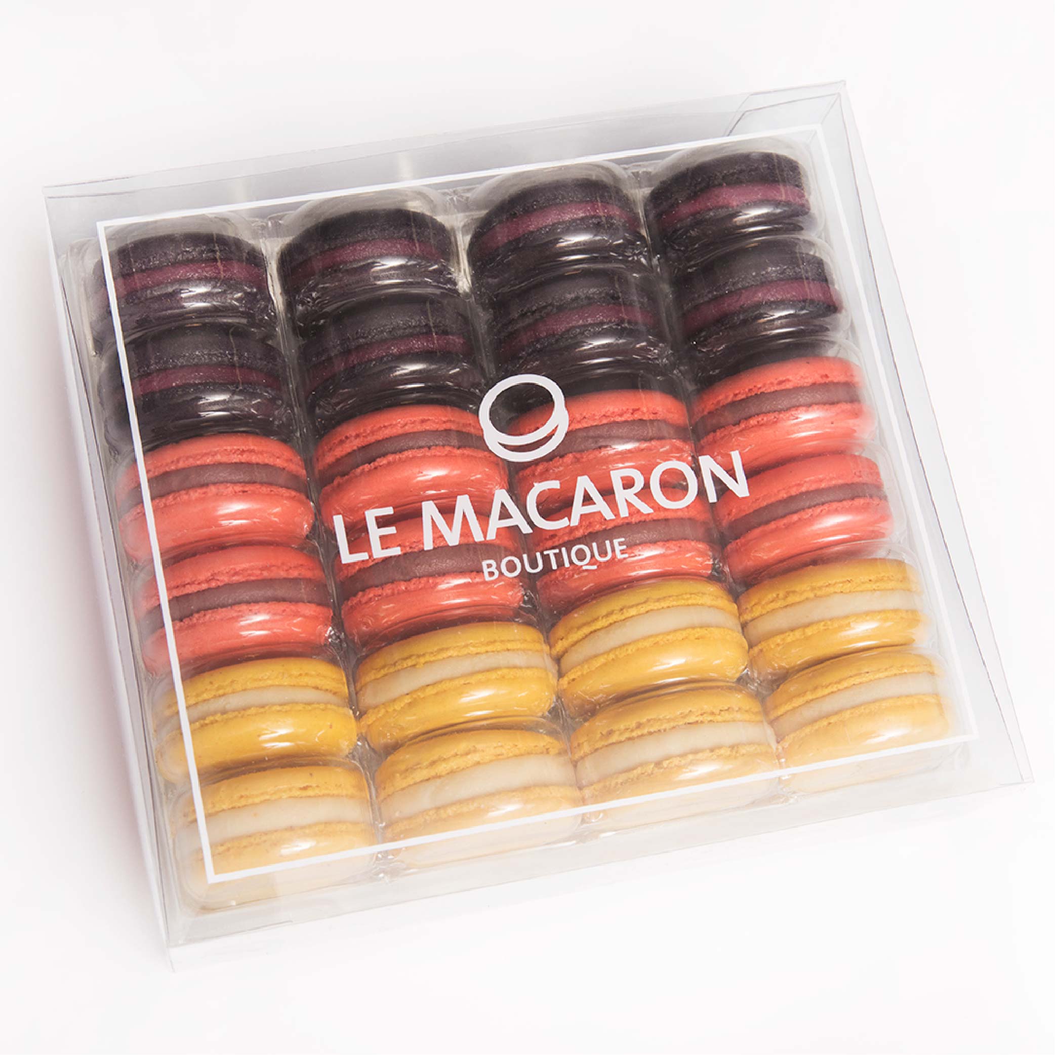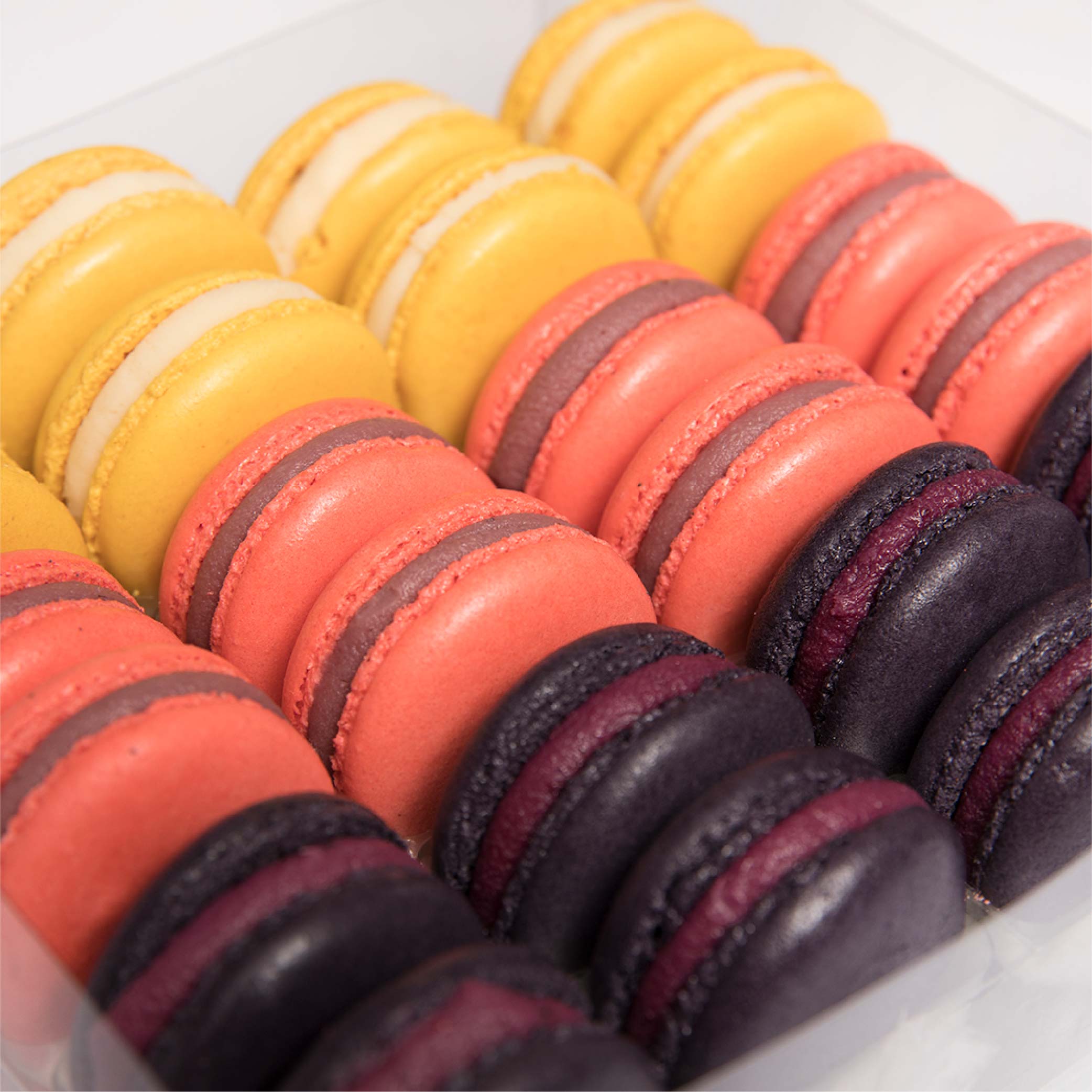 Caja con 24 macarons con nuestra mejor selección frutal, cassis, frambuesa y limón amarillo.