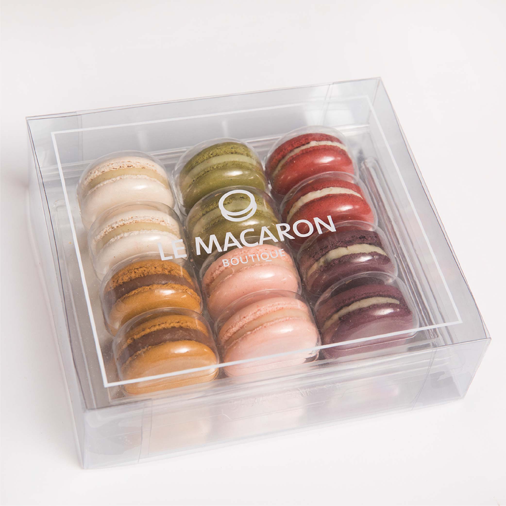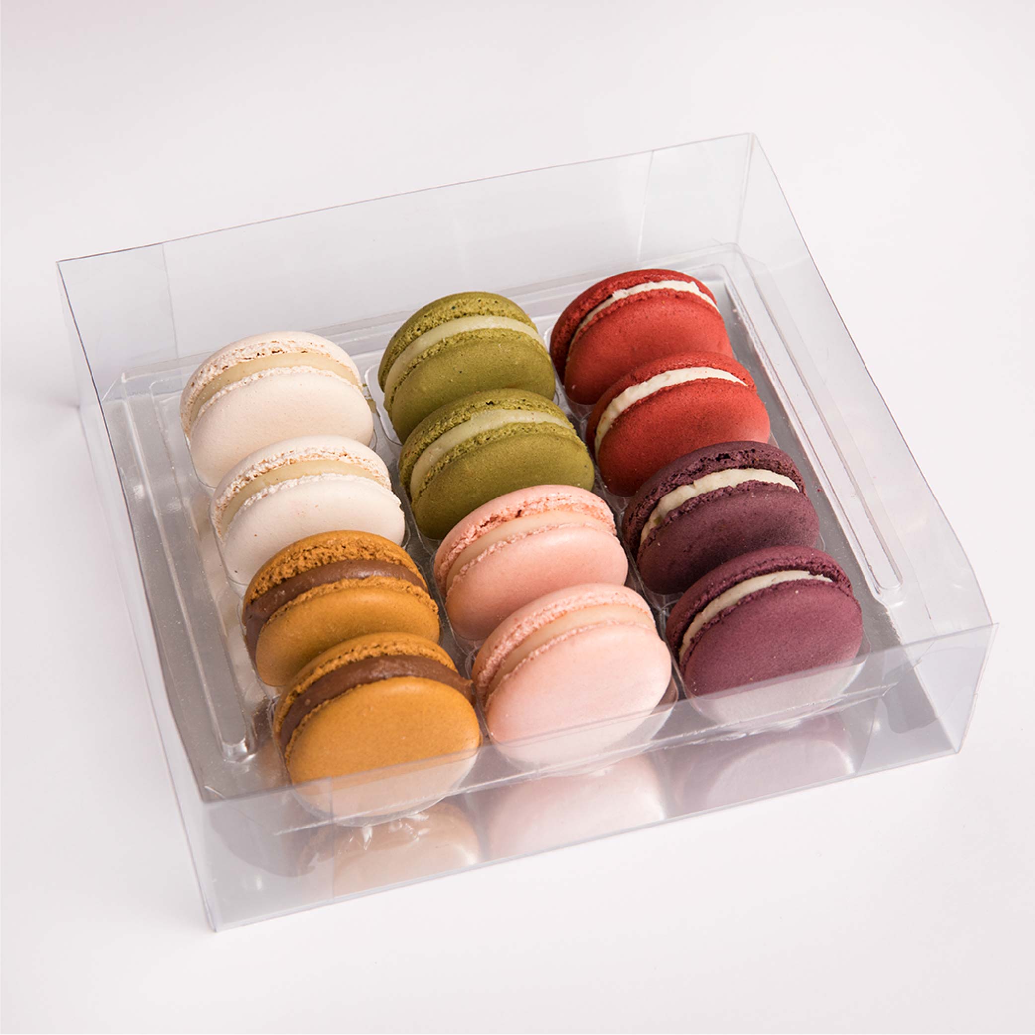 Caja de 12 macarons con los sabores más vendidos, vainilla de Papantla, caramelo flor de sal, pistache, red velvet, queso de cabra con higo, pétalo de rosas.
