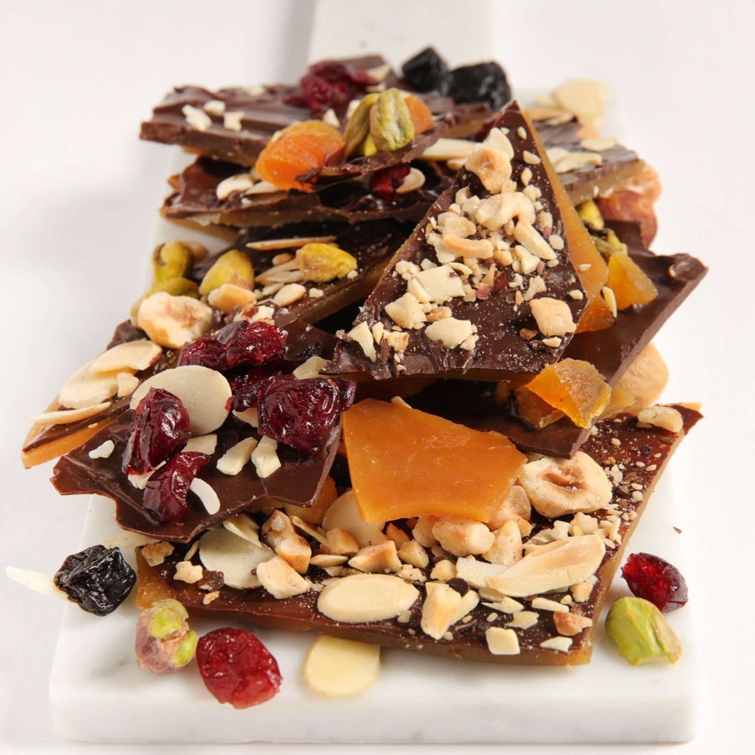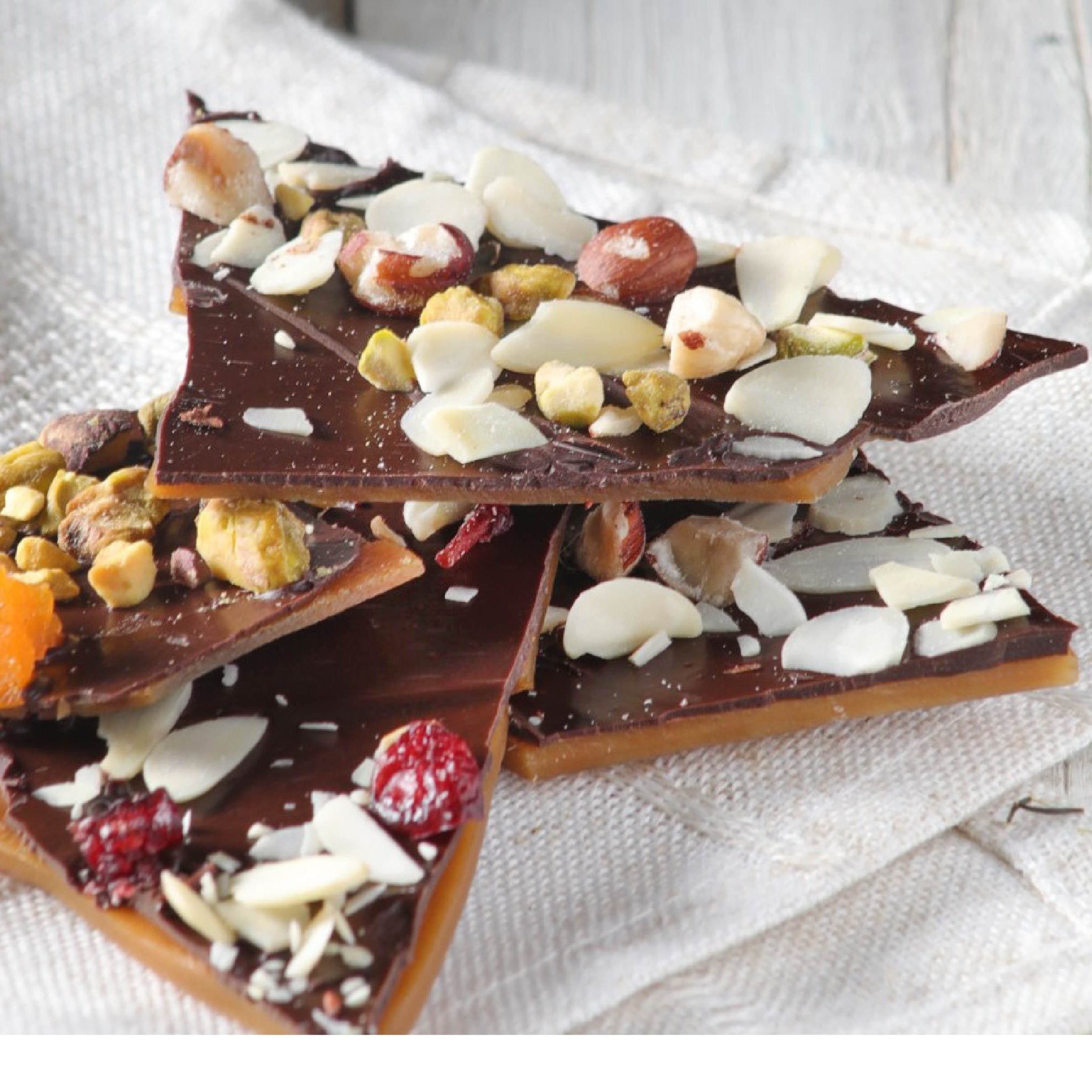 Finas láminas de caramelo con chocolate amargo, chabacanos deshidratados, arándano, pistache, avellana y almendra.