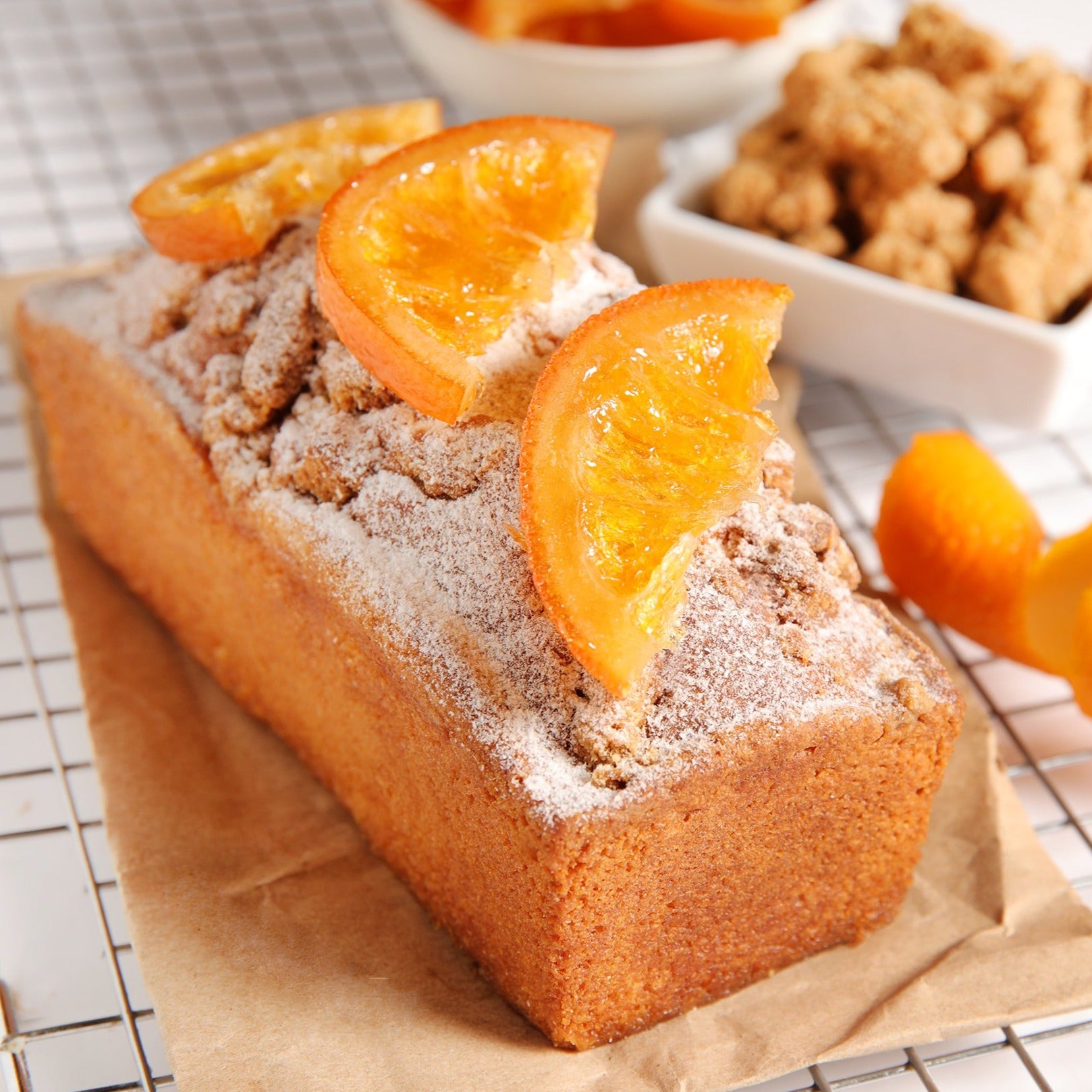 Panqué de naranja con crumble de almendra y nuestras naranjas confitadas hechas en casa.