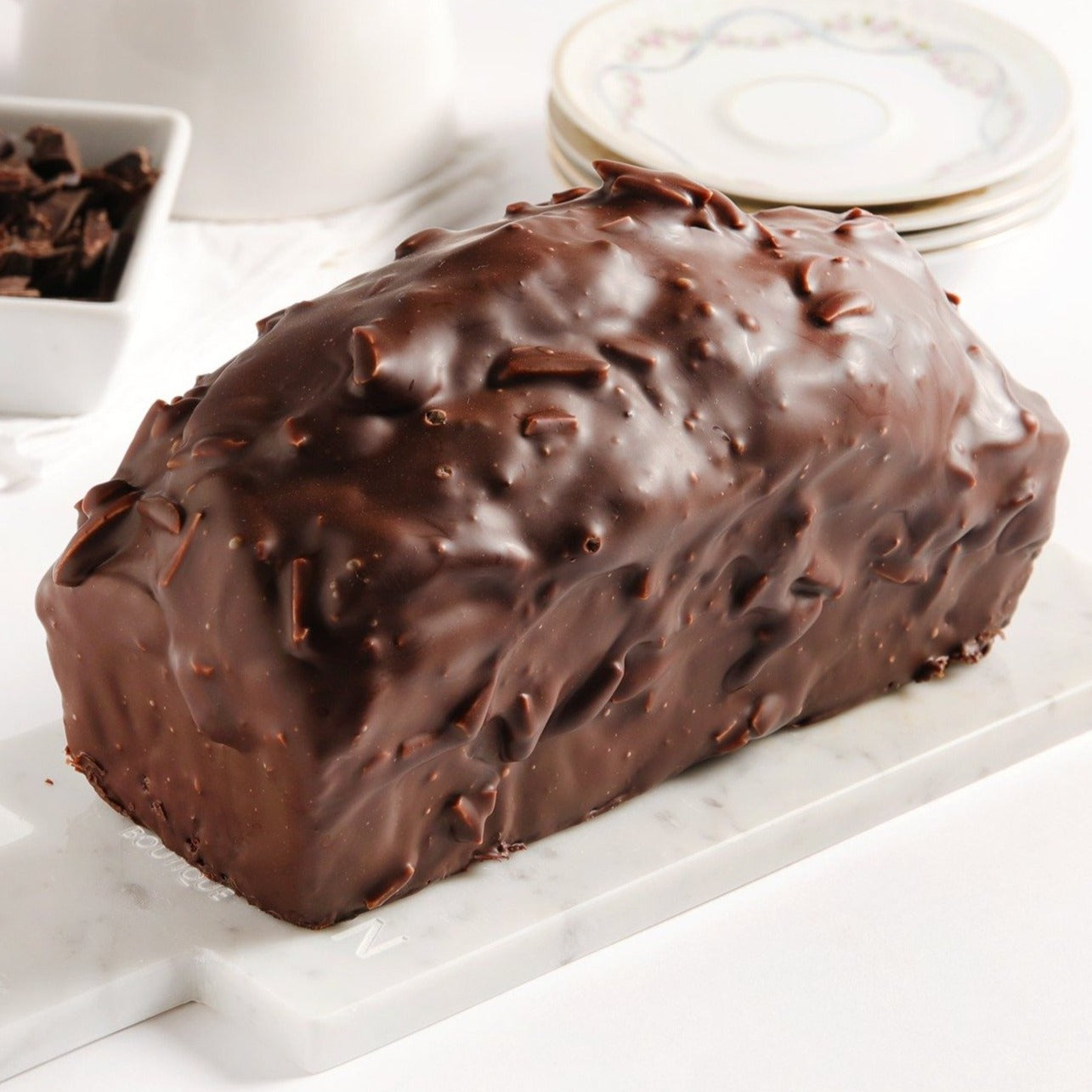 Panqué de chocolate y vainilla, glaseado de chocolate amargo con trozos de almendra.