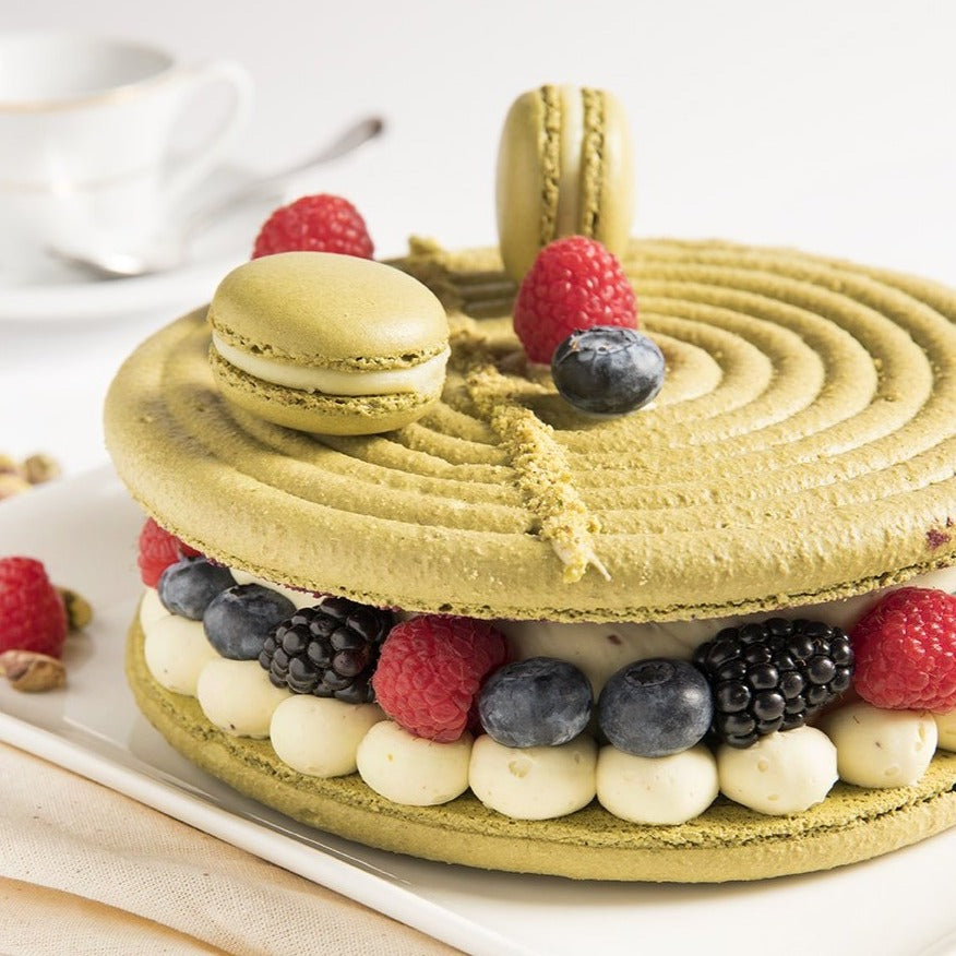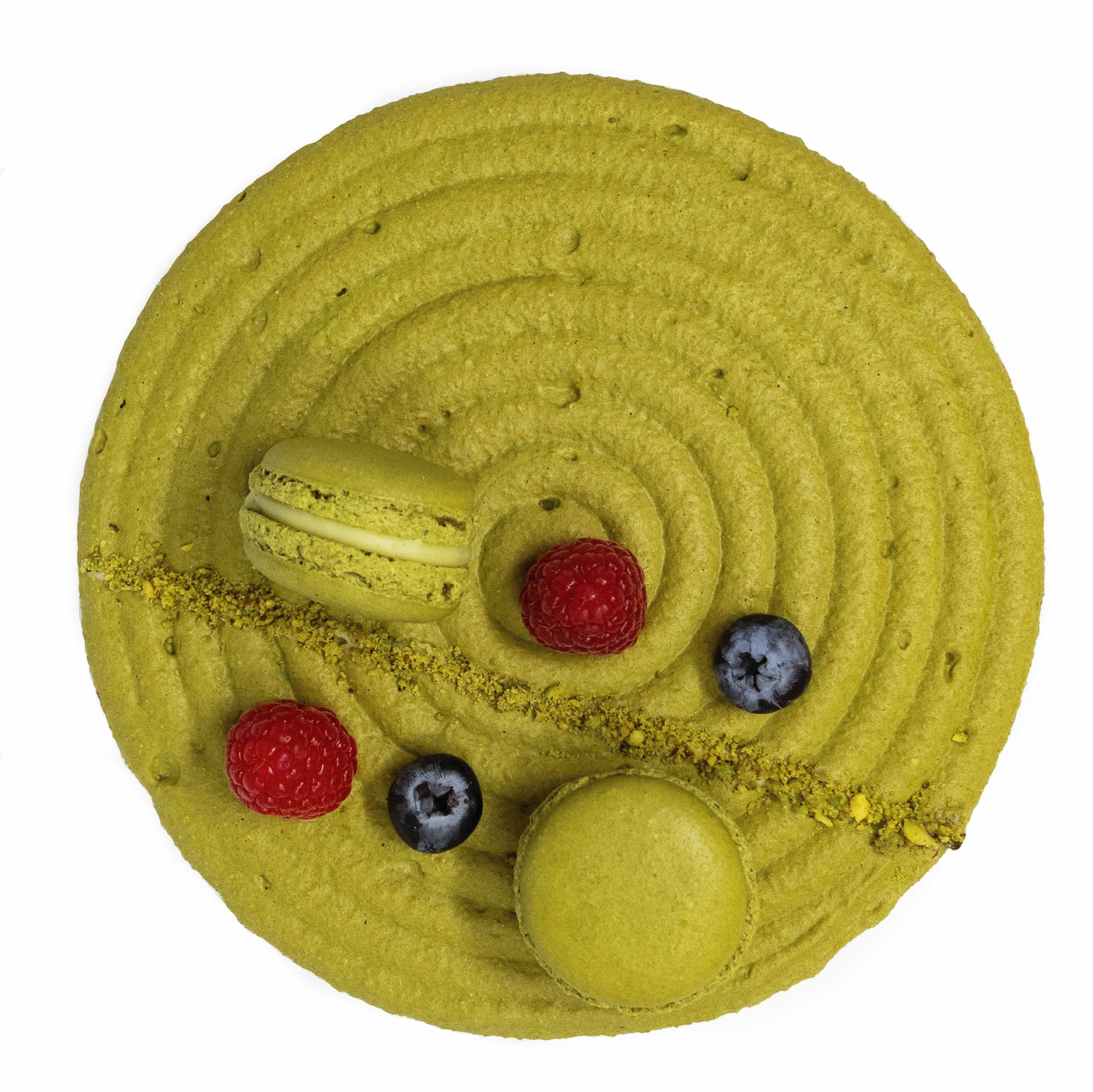 Macaron gigante con mousse y bizcocho de pistache, ganache de cassis y frutos rojos.