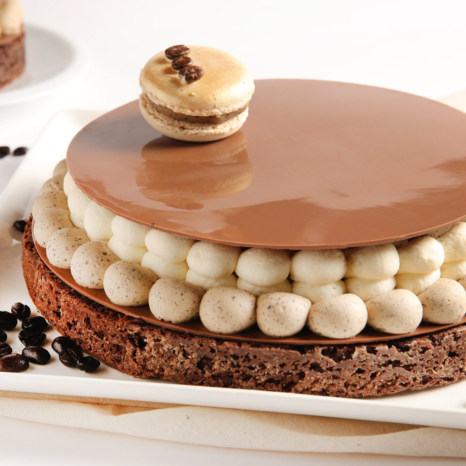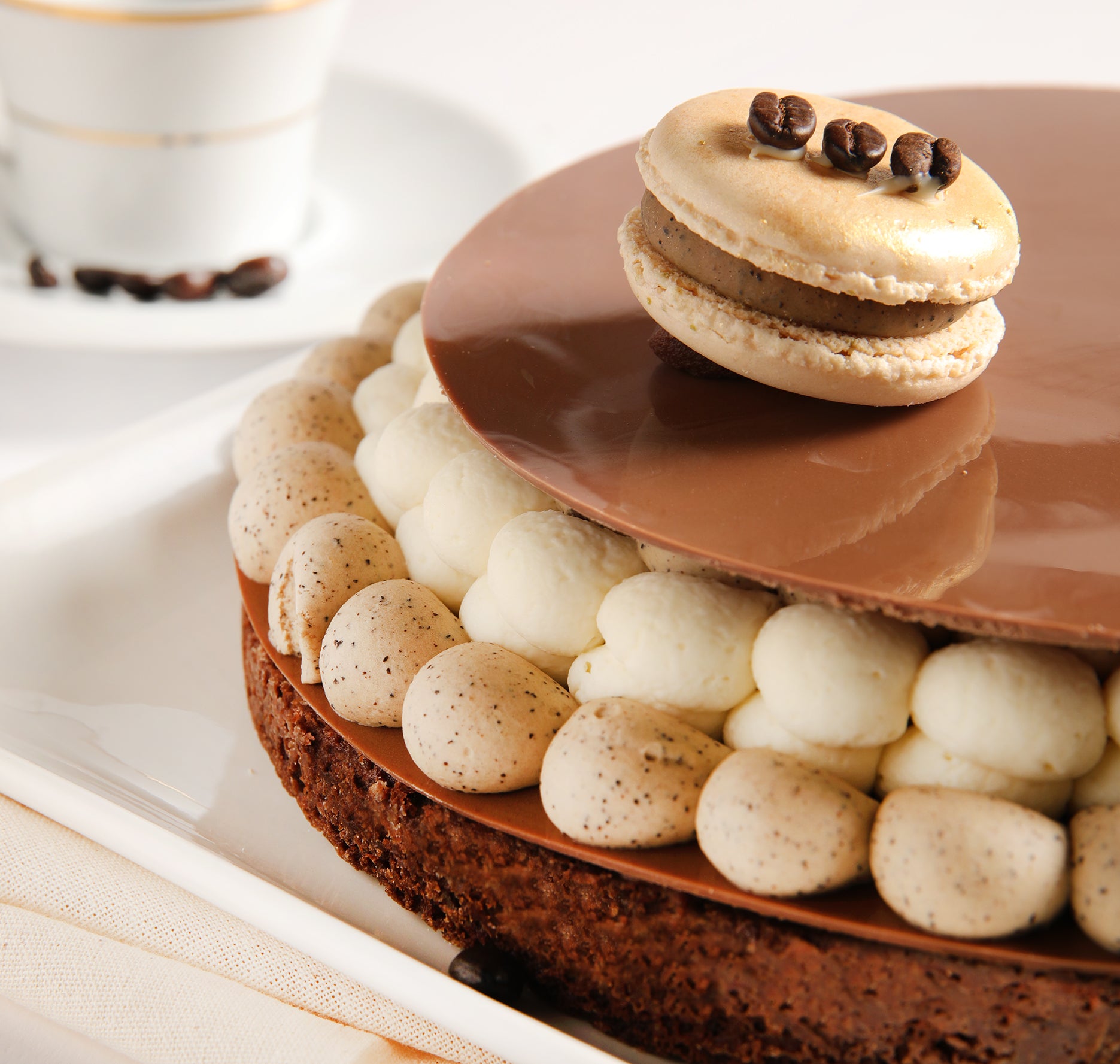 Bizcocho de chocolate, mousse de café, crema de mascarpone y láminas de chocolate belga.