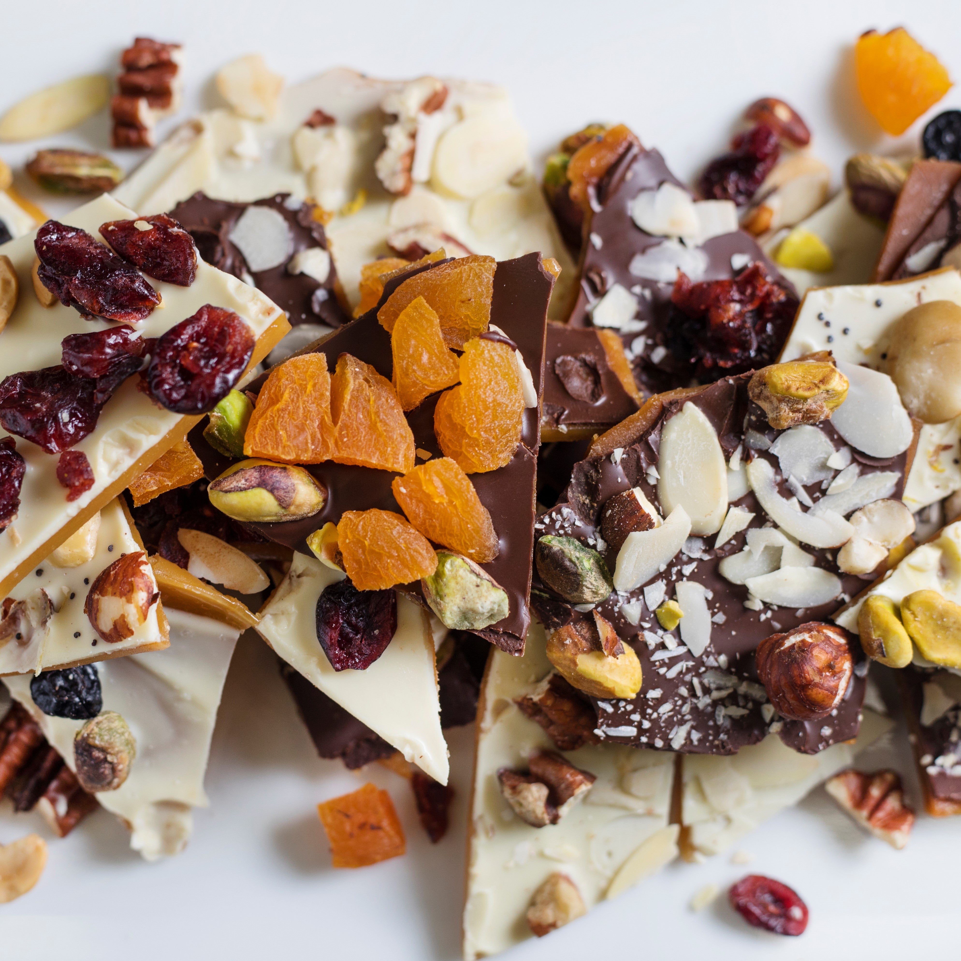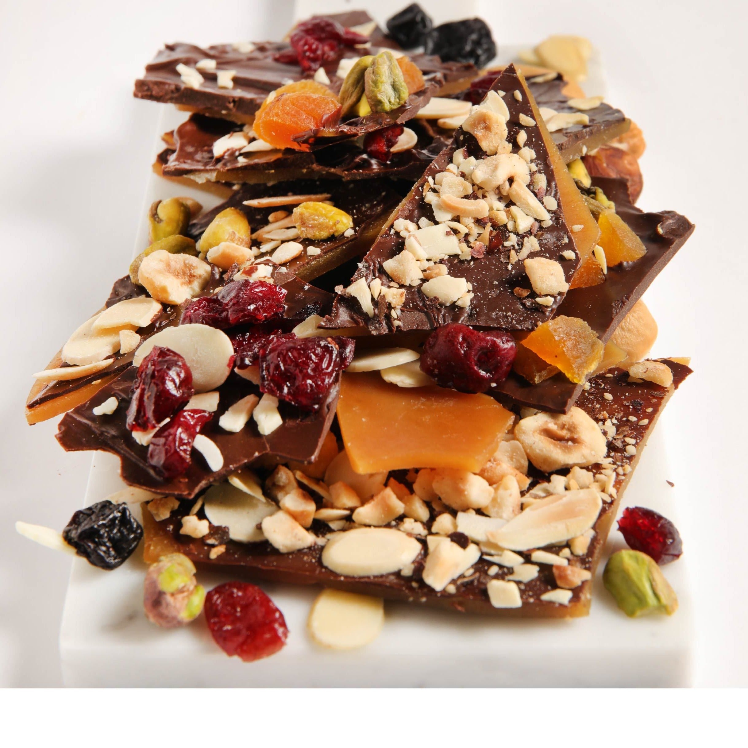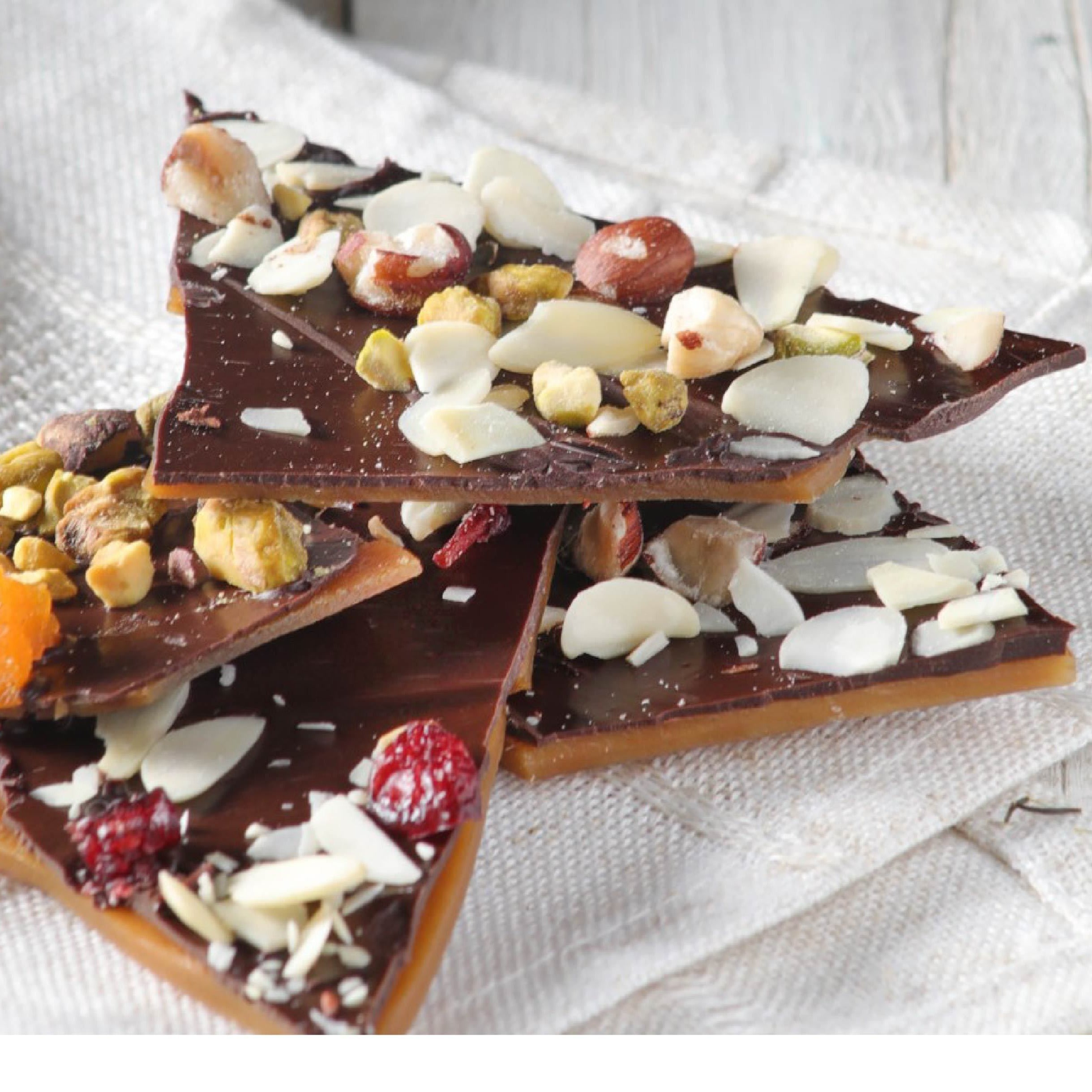Finas láminas de caramelo con chocolate amargo, chabacanos deshidratados, arándano, pistache, avellana y almendra.